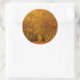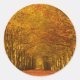 Round photo sticker of a walking path through the golden beech trees in a forest in autumn colours in fall season in the Netherlands.