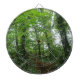 This awesome dartboard features a photograph taken in a forest in England. The beautiful trees glow with an intense green as they reach up towards the sky. A small path winds its way deep into the woods surrounded by tall trees.