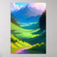 ake a journey through nature's serenity with our captivating digital art poster. This stunning masterpiece features a dirt road winding down a hill into a beautiful green valley, with trees and hills in the distance, and towering mountains reaching for the sky in the far background. Order now and let this stunning poster transport you to a world of natural wonder.