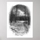 This poster features a wintry scene in black and white. A long snowy path leads out of the woods to an icy pond which is covered with snow. Bare black tree trunks frame the image. A dramatic grey sky with bright white clouds illuminates the distant clearing.