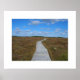 The boardwalk across a stretch of barrens at the Seaside Adjunct of Kejimkujik National Park. This flat land under a brilliant blue sky is home to beautiful wildflowers and carnivorous plants. Here in the fall, you can see many of these plants turning bright red.