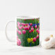 A captivating spring garden scene, showcasing a kaleidoscope of colours and textures. Delicate blossoms of various colours, including bright pink cherry blossoms, are in full bloom, adding pops of colour to the landscape. Lush greenery fills the scene, with vibrant ferns and blooming wildflowers tucked throughout the garden. Birds are chirping merrily in the trees, with a butterfly or two gracefully flitting through the colourful scene. Soft, natural light illuminates the garden, showcasing the intricate details of the flowers and leaves, including a subtle bokeh effect. This high-definition image highlights the beauty and serenity of a spring garden.
