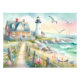 Capture the serene beauty of coastal living with this charming watercolor featuring a seaside cottage and graceful lighthouse overlooking the ocean. A weathered wooden path, lined with colorful spring wildflowers, leads through the landscape, inviting you to stroll toward the sea. Seagulls rest and soar in the gentle breeze while glowing lights from the cottage create a warm, welcoming atmosphere. Soft pastel skies and peaceful waves complete this whimsical, cottagecore coastal scene. Perfect for beach house decor, spring wall art collections, and those who adore dreamy seaside landscapes. Display this as part of the Cottage by the Sea Collection for a cozy and nostalgic touch to any room. AI generated artwork.