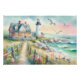 Capture the serene beauty of coastal living with this charming watercolor featuring a seaside cottage and graceful lighthouse overlooking the ocean. A weathered wooden path, lined with colourful spring wildflowers, leads through the landscape, inviting you to stroll towards the sea. Seagulls rest and soar in the gentle breeze while glowing lights from the cottage create a warm, welcoming atmosphere. Soft pastel skies and peaceful waves complete this whimsical, cottagecore coastal scene. Perfect for beach house decor, spring wall art collections, and those who adore dreamy seaside landscapes. Display this as part of the Cottage by the Sea Collection for a cosy and nostalgic touch to any room. AI generated artwork.