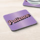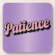 This lavender coaster features a pink script Patience affirmation. The affirmation is in retro pink script and slanted. The coaster is a hard plastic coaster with a cork backing. There are six coasters in the set.