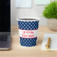 Patriot custom paper cups with American star flag pattern. Disposable party supplies with navy blue or custom colour. Double sided print with personalised text. Elegant design for Birthday, wedding, bridal shower, engagement, anniversary, baby shower, BBQ, office party, 4th of July and more. Modern typography. Great for coffee and other drinks.