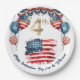 These custom party plates feature a patriotic fourth of July theme. An image of the American flag is placed in the centre, with celebration balloons placed on either side. A matching patriotic bunting banner is placed across the top. The event date July 4th is printed in gold above the flag.