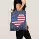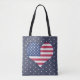 Patriotic tote bag with heart shaped USA flag on starry background.