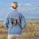 The image on this patriotic denim jacket is a watercolor image of three charging horses with a tattered American flag behind them. The middle horse is white, and the other two horses are bay. Beautiful!