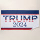 This patriotic Donald Trump 2024 presidential campaign beach towel features the name "Trump" printed in an American flag pattern. The stars are printed on the top half and the stripes on the bottom portion. The election year "2024" is printed below in a navy blue font. The top and bottom portions of the towel feature blue and red banners.