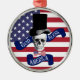 Funny proud patriotic American flag design with a fun vintage gothic skull wearing Abraham Lincoln style top hat and a red white and blue stars and stripes american star spangled banner flag , with God bless America text saying.