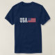 This t-shirt design features a bold and patriotic theme. Centred on the chest is the text "USA" in large, white, collegiate-style block letters. Immediately following the text is a stylised American flag, with its stripes slightly wavy to give a sense of motion and energy. The design is printed on a solid navy blue shirt, which enhances the contrast and makes the red, white, and blue elements stand out vibrantly. Perfect for national holidays, sporting events, or showing American pride year-round.