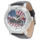 This watch face features a black bagger-style motorcycle, centred against a dynamic American flag backdrop that radiates outwards. A stylised sun is setting on the horizon behind distant mountains. The design combines patriotism with a love for motorcycling, clearly displaying white watch hands and numbers for time-telling.