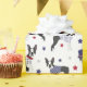 Patriotic Boston Terriers dressed in red, white and blue outfits with stars and stripes. Dog bones and star background Boston Terrier dog pattern.