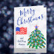 Send your patriotic Christmas greetings with these red, white and blue Christmas cards with a fun tree, an American flag and your custom text. Set on a light gray marble background that showcases Merry Christmas in a bold and fanciful bright blue handwritten font, these patriotic greeting cards are easy to personalize. All text templates, inside and out, can be edited so you can add your Christmas letter right inside the card if you like. From God Bless America on the front to the red, white and blue decorations on the green tree, these patriotic Christmas cards will spread USA pride and Christmas cheer to friends and family alike.