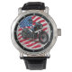This watch face prominently features a dark-coloured cruiser motorcycle against a vibrant, waving American flag background. The motorcycle has subtle blue accents, matching the flag's colours. The design captures a sense of freedom and patriotism, with clear white watch hands and numbers for easy time reading.