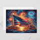 A patriotic design featuring an American flag waving proudly against a backdrop of fireworks bursting in the night sky, symbolising freedom, unity, and the American dream