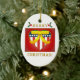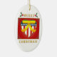A beautiful double sided, U.S. patriotic heart, with yellow ribbon oval ceramic ornament. This ornament features a patriotic heart, it's coloured in red white and blue, and has a stars and stripes design to reference the American Flag. The heart also has a golden trim, and a big yellow support the troops ribbon on top. The heart is on a glowing look red background. The ornament reads Merry Christmas in a beautiful golden lettering with holly and berries on top! This unique digital artwork is displayed on both the front and back of the ornament. A beautiful ornament to support the troops, for friends and family, a great addition to any ornament collection, a great gift for a veteran or someone currently serving in the U.S. military, or a patriotic collector. This design is available on different shapes and styles of ornaments and other wonderful gift items too. For more military Christmas holiday themed styles of ornaments, gifts, stickers, tags, cards, stamps and much more please visit our store!