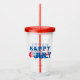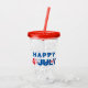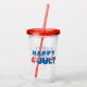 This acrylic tumbler with it 's own lid and straw has an image of the happy July 4th print.