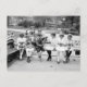 Old photo of five girls and a boy, sitting on a park bench, knitting. 1910s or 1920s. Patriotic view with stars and stripes pattern on cloth in picture. Probably related to WW1.