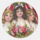Three girls wearing white dresses and holding bouquets of roses, stand beneath a laurel wreath within which is the word "Peace." The US flag is draped in the background of this vintage patriotic postcard from 1912.
