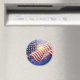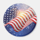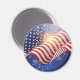 This round magnet is shown with a image print of a patriotic USA Flag and fireworks.