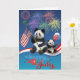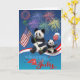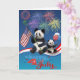 A baby Panda holds up patriotic balloons as it celebrates for its first time, a forth of July Independence day while the adult Panda waves the American flag against a background of fireworks.