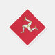 These paper napkins prominently display the flag of the Isle of Man, showcasing its distinctive triskelion symbol on a bold red field. The triskelion, with its three armoured legs joined at the thigh, symbolises resilience and determination, reflecting the island's motto "Quocunque Jeceris Stabit," which translates to "Whichever way you throw it, it will stand."