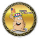 Patriotic potato character with a American hat and American flag. With home of the brave in red white and blue. And a gold foil texture.