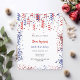 A chic white background. Decorated with patriotic coloured confetti and party streamers in red blue and white. Personalise and add a name and party details. The name is written with a hand lettered style script.