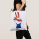This patriotic hand painting is showing the peace sign in the colours of red, white, and blue. The word Peace is written under the hand in red letters, on the front side of the bag. A larger peace sign hand is printed on the back of the bag. The text can be easily customised on the template form. The fingers are red, the palm is white, and the wrist area is blue. This is a great design for Memorial Day, July 4th, and election events.