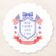 This patriotic bridal shower coaster design features a watercolor crest with a light red white and blue patriotic crest with American flags and a blue bow. Text in the center of the crest says "Red, white and I do." You can personalize with your event date.