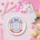 This patriotic bridal shower paper plate design features a watercolor crest with a light red white and blue patriotic crest with American flags and a blue bow. Text in the center of the crest says "Red, white and I do."