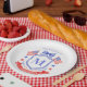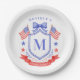 This patriotic bridal shower paper plate design features a watercolor crest with a light red white and blue patriotic crest with American flags and a blue bow. You can personalize with your monogram and name.