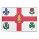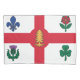 The design showcases the official flag of Montreal, which features a bold red cross dividing a white background into four quadrants. Each quadrant contains a floral emblem representing the city’s founding communities: the blue fleur-de-lis for the French, the red rose for the English, the purple thistle for the Scots, and the green shamrock for the Irish. At the centre of the cross is a red maple leaf symbolising Canadian unity. This iconic flag design reflects Montreal’s diverse roots and enduring spirit.