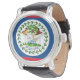 This elegant timepiece proudly showcases the vibrant design of the Belizean flag. The watch strap and dial elegantly display the royal blue background with a red stripe at the top and bottom edges. Centred within the blue field is the national coat of arms featuring a ship in full sail over the waters, flanked by two woodcutters above a mahogany tree, with the national motto "Sub Umbra Floreo" ("Under the Shade, I Flourish").