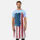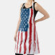 This apron is shown in a patriotic stars and stripes flag print, perfect for July 4th BQ.