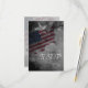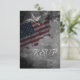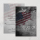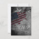 This patriotic wedding RSVP card features a United States shaped American Flag with decorative stars and a grey and black grunge background. ^