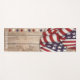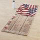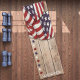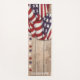 One side of this yoga mat features US patriotic bunting in red and white stripes plus a blue field with white stars draped over a wooden slat background. The left side features a row of red, white, and blue stars. Personalize template field with your information, remove it or use the edit design tool to select a font style, size, and color you like.