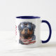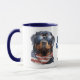 The feature on this unique mug is a watercolor image of a Rottweiler dog wrapped in an American flag and wearing sunglasses. The image is on two sides of the mug, with a stars and stripes paw print and your custom text between them.