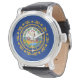 This stylish timepiece proudly showcases the distinctive design of the New Hampshire flag. The watch strap and dial elegantly display the blue field with the state seal centred, surrounded by laurel leaves and nine stars. The state seal features the frigate Raleigh, a sheaf of arrows, and a pine tree, symbolising the state's naval history, preparedness in defence, and natural resources.
