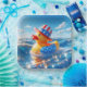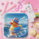 A vibrant yellow rubber duck sporting a hat with the American flag pattern floats on the sparkling blue water of an ocean