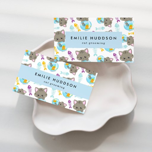 Cute, fun and adorable business cards with cats, fishbowls and fishes. Modern and trendy design, perfect for pet shops, cat sitters, cat groomers and cat breeders.