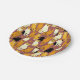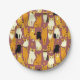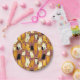 Paper plates patterned in a playful pattern of stylised cats in warm shades of ginger, cream, black, and brown on a caramel brown background. Each cat has its own cute expression and markings, with little paw prints scattered throughout.