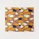 Tapestry in a playful pattern of stylised cats in warm shades of ginger, cream, black, and brown on a caramel brown background. Each cat has its own cute expression and markings, with little paw prints scattered throughout.