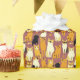 Wrapping paper in a playful pattern of stylised cats in warm shades of ginger, cream, black, and brown on a caramel brown background. Each cat has its own cute expression and markings, with little paw prints scattered throughout.