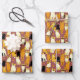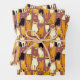 Wrapping paper in a playful pattern of stylised cats in warm shades of ginger, cream, black, and brown on a caramel brown background. Each cat has its own cute expression and markings, with little paw prints scattered throughout.