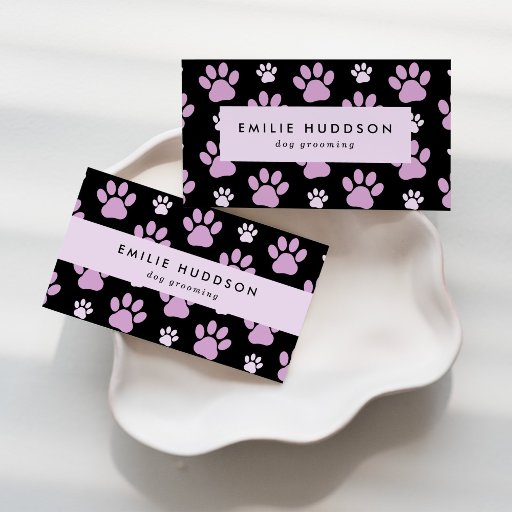 Cute, fun and adorable business cards with lilac and purple paws. Modern and trendy design, perfect for dog trainers, dog groomers, dog walkers, pet sitters, pet shops and veterinarians.