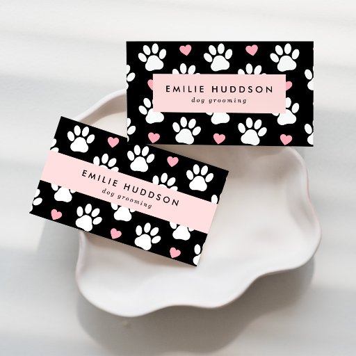 Cute, fun and adorable business cards with white paws and pink hearts. Modern and trendy design, perfect for dog trainers, dog groomers, dog walkers, pet sitters, pet shops and veterinarians.
