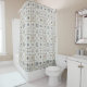 Shower curtain with a series of nine (9) different Spanish-style tiles in neutral coloured, mosaic pattern.